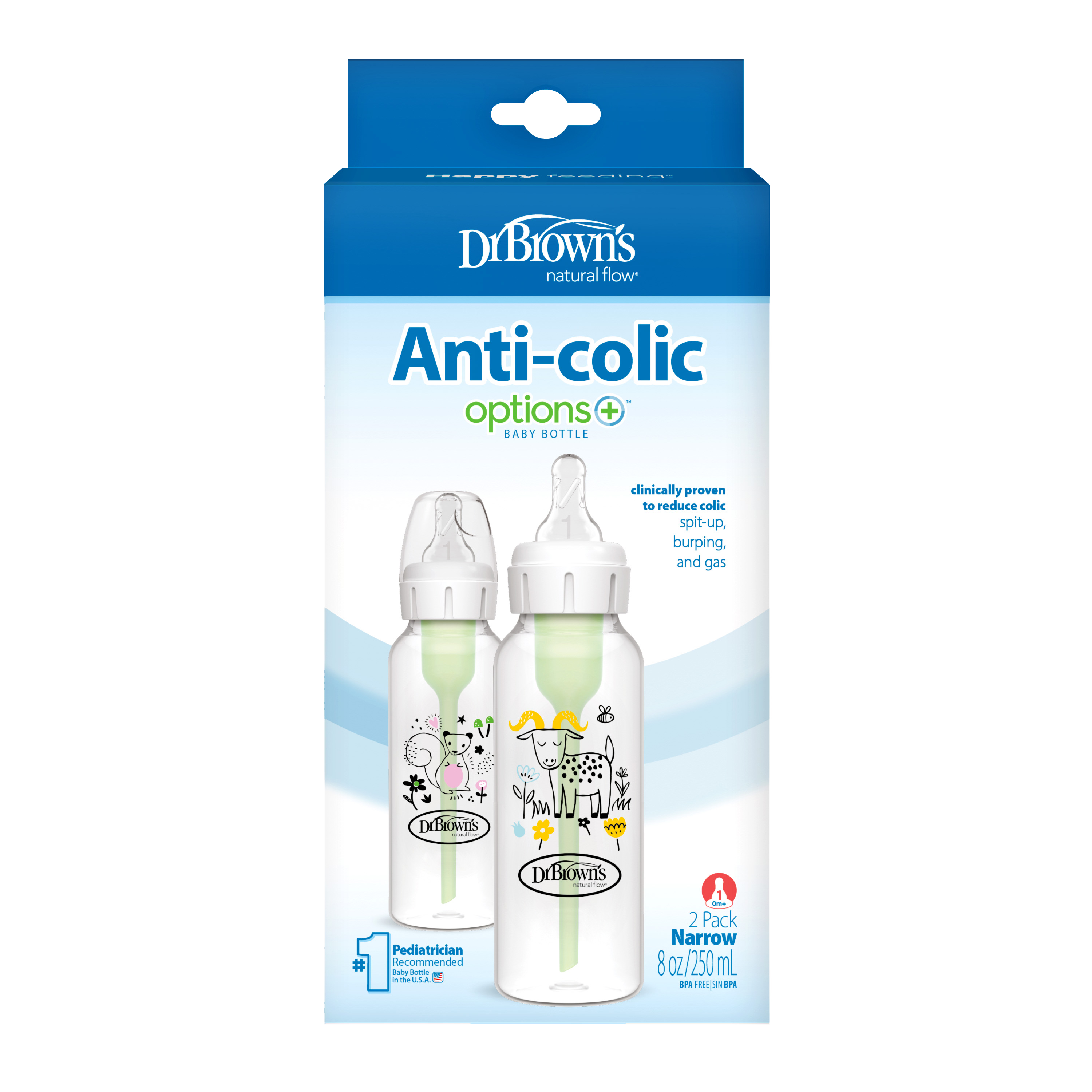 Μπιμπερό πλαστικό Options+ Σκιουράκι/Κατσικούλα (Στενός λαιμός) 2 x 250 ml