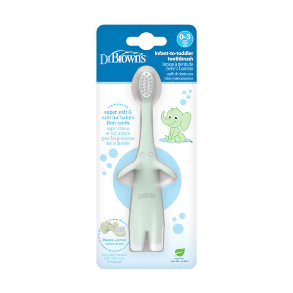Οι εξαιρετικά μαλακές σιλικονούχες τρίχες καθαρίζουν με ασφάλεια και απαλότητα τα πρώτα δοντάκια και τα ούλα του μωρού, ενώ το ανθεκτικό αλλά ταυτόχρονα μαλακό υλικό της οδοντόβουρτσας είναι ιδανικό για ευαίσθητα στόματα. Τα «αυτάκια» του ελέφαντα επιτρέπουν στο μωρό να ακουμπά κάτω την οδοντόβουρτσα χωρίς να έρχεται σε επαφή με την επιφάνεια, ενώ η φαρδιά βάση επιτρέπει την ασφαλή αποθήκευσή της σε όρθια θέση.